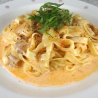 鮭ときのこはクリームソースと相性抜群♪平たい麺のフェットチーネで召し上がれ!